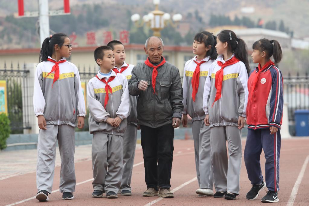 閆青海(中)給孩子們講奮斗創(chuàng)業(yè)的故事(2019年4月8日攝)。新華社發(fā)
