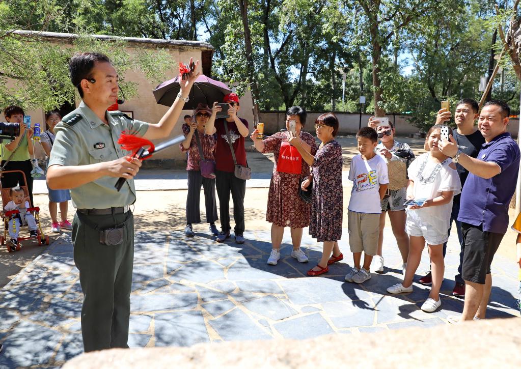 在西柏坡舊址,講解員韓向飛為游客進行講解(2019年8月30日攝)。新華社記者楊世堯攝