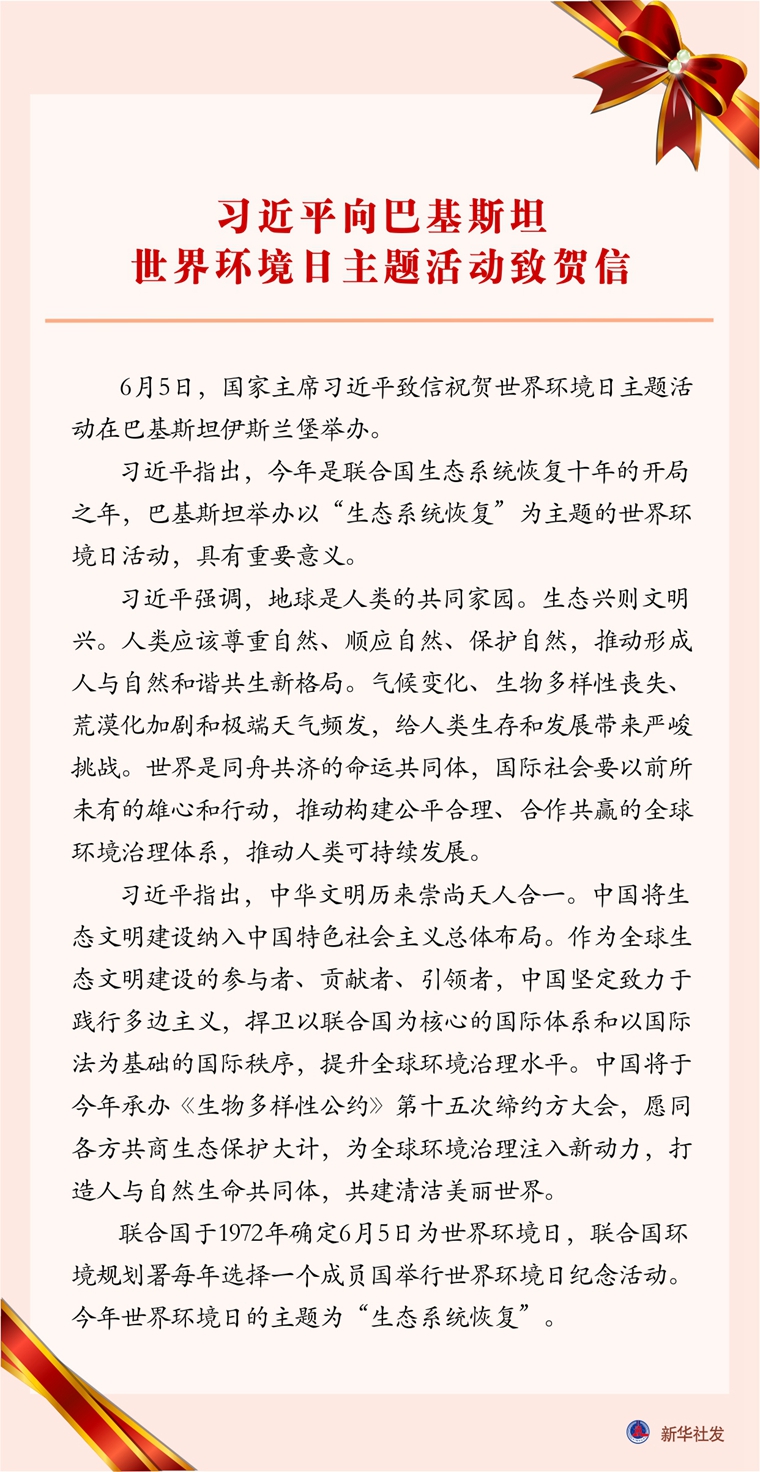 新華社北京6月5日電 6月5日,國家主席習(xí)近平致信祝賀世界環(huán)境日主題活動(dòng)在巴基斯坦伊斯蘭堡舉辦。