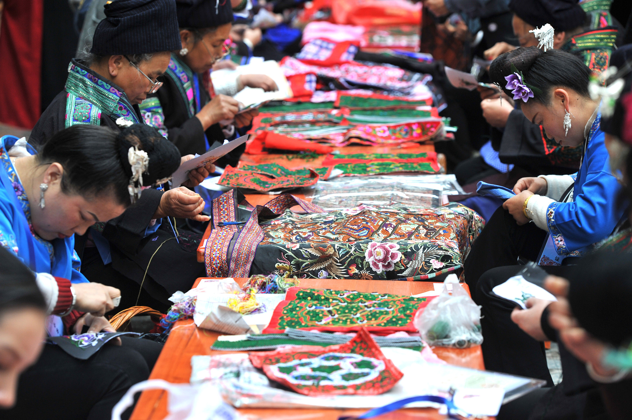 △2021年4月25日,貴州黔東南,200余名繡娘在苗繡技能大賽中飛針走線。(圖/視覺中國)