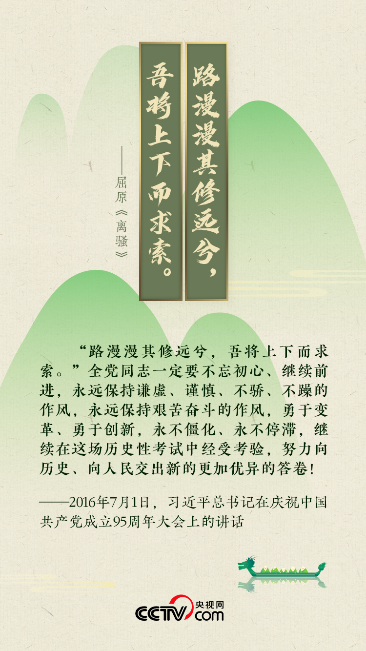 2016年7月,在慶祝中國(guó)共產(chǎn)黨成立95周年大會(huì)上,習(xí)近平總書(shū)記娓娓道出屈原的名句“路漫漫其修遠(yuǎn)兮,吾將上下而求索”,號(hào)召全黨同志不忘初心,勇于變革創(chuàng)新,繼續(xù)前進(jìn)。