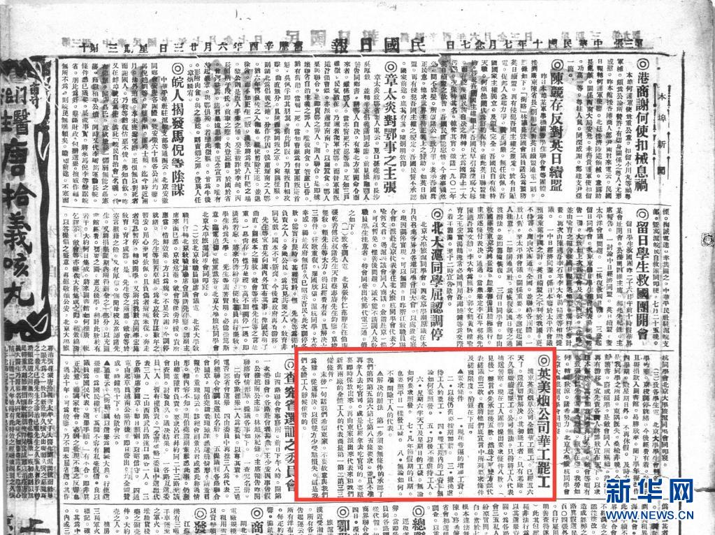 1921年7月27日的《民國(guó)日?qǐng)?bào)》上登載了上海浦東英美煙草公司華工罷工的消息。新華社發(fā)(上海圖書(shū)館提供)