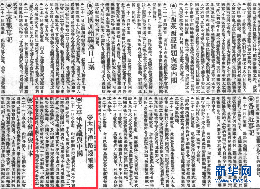 1921年7月23日《申報(bào)》上的消息《太平洋會(huì)議與中國(guó)》。新華社發(fā)(上海圖書(shū)館提供)