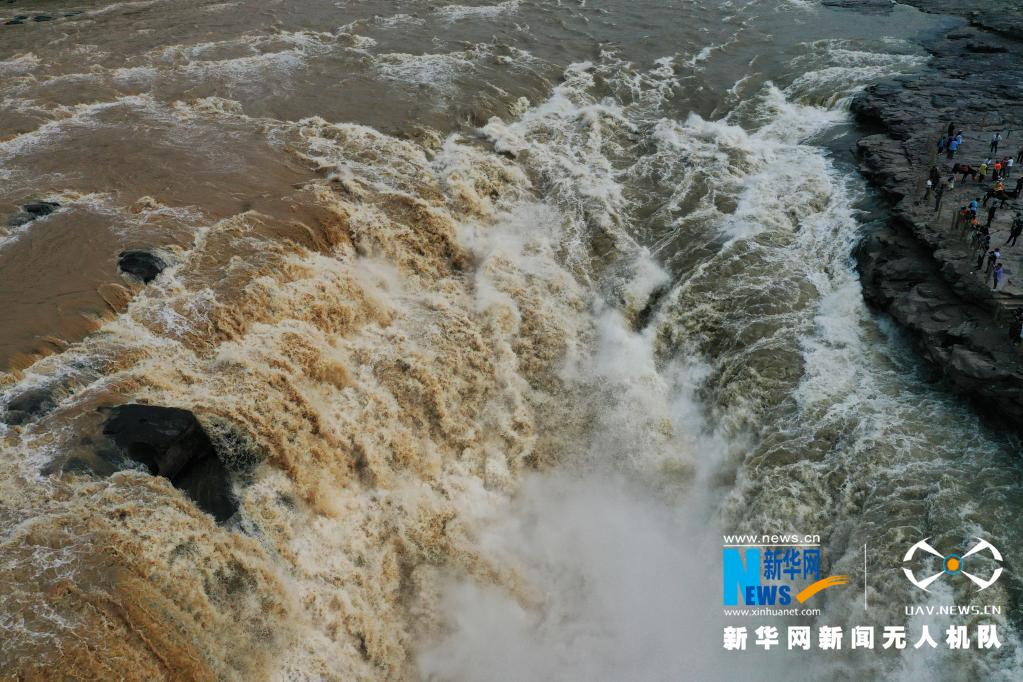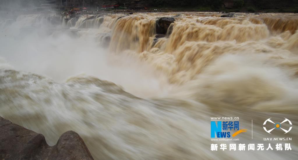 近日,受上游局部地區(qū)強降雨影響,黃河壺口瀑布出現(xiàn)“西邊濁流翻滾,東邊白浪滔滔”的奇特景觀。新華網(wǎng)發(fā)(呂桂明 攝)