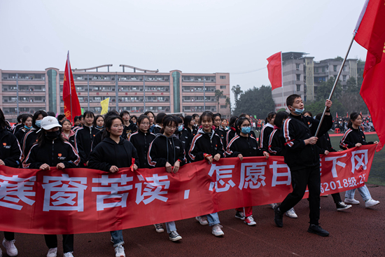3月9日,高考誓師大會現(xiàn)場,我們班的學生舉著橫幅和班旗,列隊準備走過主席臺。橫幅上寫著“同是寒窗苦讀,怎愿甘拜下風”。
