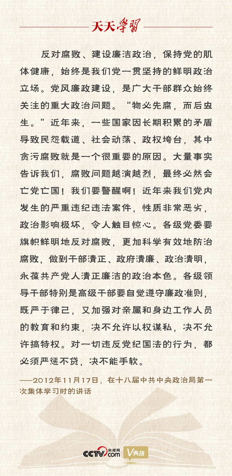 黨風(fēng)廉政建設(shè)永遠(yuǎn)在路上,反腐敗斗爭永遠(yuǎn)在路上。當(dāng)前,反腐敗斗爭雖然取得了壓倒性勝利并不斷鞏固發(fā)展,但形勢依然嚴(yán)峻復(fù)雜。腐敗問題具有頑固性、反復(fù)性、長期性,我們必須堅(jiān)持把反腐敗斗爭擺在極為重要的位置,才能經(jīng)受住“四大考驗(yàn)”、克服“四種危險(xiǎn)”。只要堅(jiān)持管黨治黨不放松、正風(fēng)肅紀(jì)不停步、反腐懲惡不手軟,我們就一定能夠跳出治亂興衰的歷史周期率,贏得這場輸不起也決不能輸?shù)恼味窢?,引領(lǐng)和保障中國特色社會主義巨輪行穩(wěn)致遠(yuǎn)!