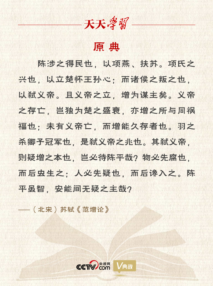 《范增論》是蘇軾早期的一篇史論文章,收錄在《古文觀止》卷十。文中蘇軾針對陳平用計(jì)離間項(xiàng)羽和范增的觀點(diǎn),翻空出奇,立意新穎地提出:“物必先腐也,而后蟲生之;人必先疑也,而后讒入之。”作者打了個(gè)比方,東西總是自身先腐爛,然后蟲子才會寄生,說明事物總是自己先有弱點(diǎn)然后才為外物所侵。指出正是由于項(xiàng)羽生性多疑,聽信讒言,才被敵人利用,從而招致慘敗。