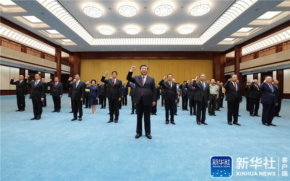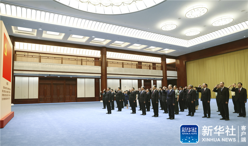 6月18日,黨和國家領導人習近平、李克強、栗戰(zhàn)書、汪洋、王滬寧、趙樂際、韓正、王岐山等在中國共產黨歷史展覽館參觀“‘不忘初心、牢記使命’中國共產黨歷史展覽”。這是參觀結束后,習近平帶領黨員領導同志一起重溫入黨誓詞。新華社記者 李學仁 攝