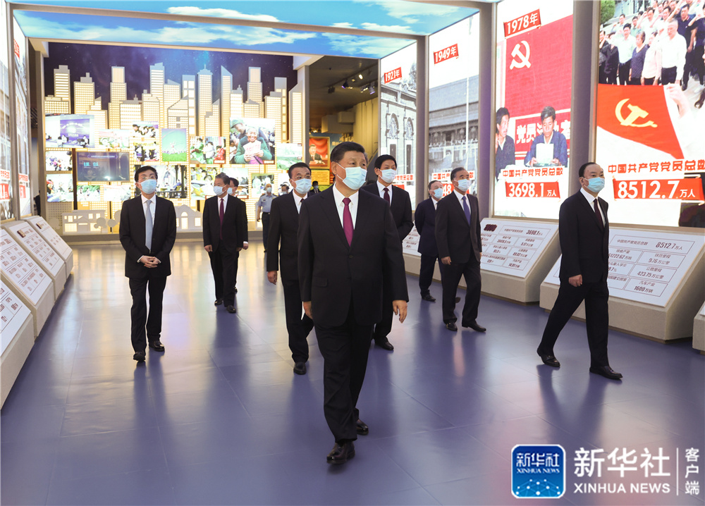 6月18日,黨和國家領導人習近平、李克強、栗戰(zhàn)書、汪洋、王滬寧、趙樂際、韓正、王岐山等在中國共產黨歷史展覽館參觀“‘不忘初心、牢記使命’中國共產黨歷史展覽”。這是習近平在參觀展覽。新華社記者 李學仁 攝