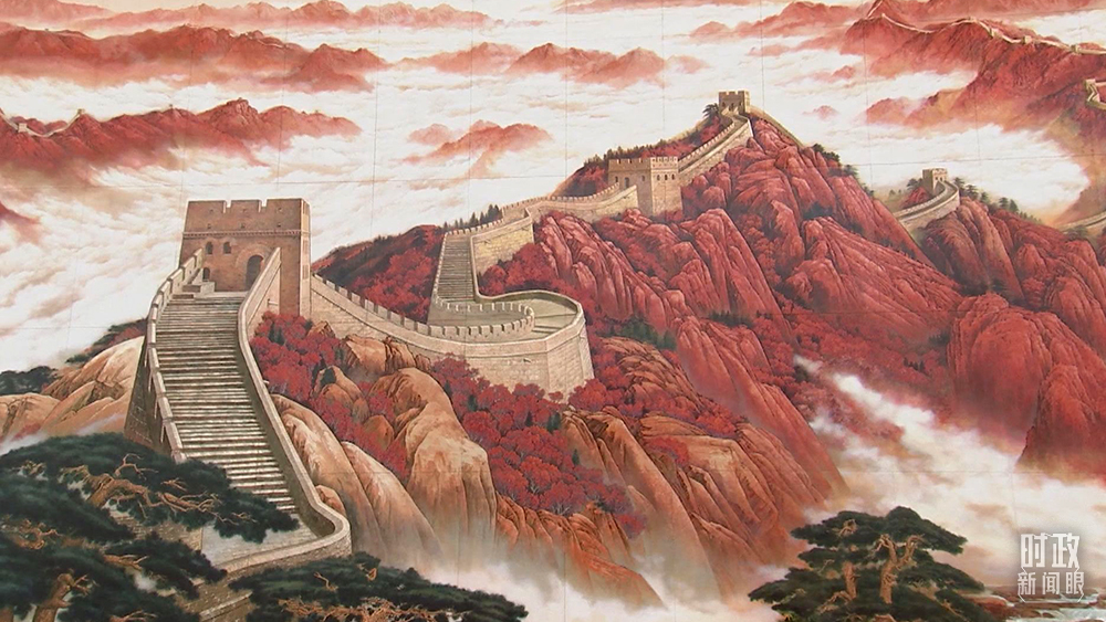 △氣勢(shì)磅礴的長(zhǎng)城主題漆畫(huà)(總臺(tái)央視記者王策拍攝)
