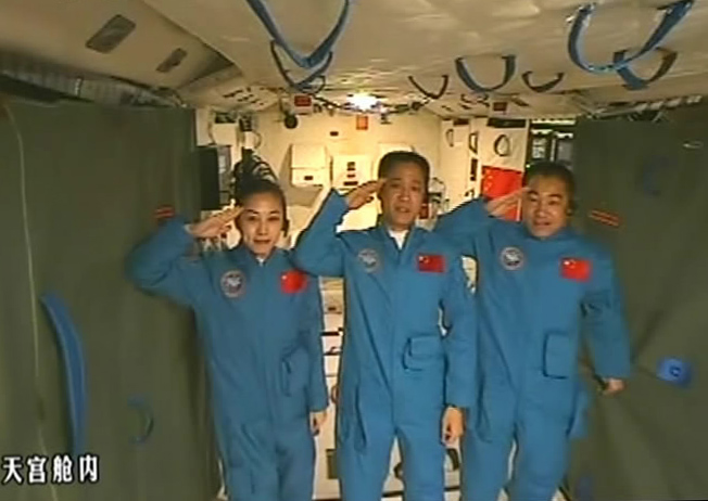 ↑6月17日在北京航天飛行控制中心拍攝的進駐天和核心艙的航天員向全國人民敬禮致意的畫面。