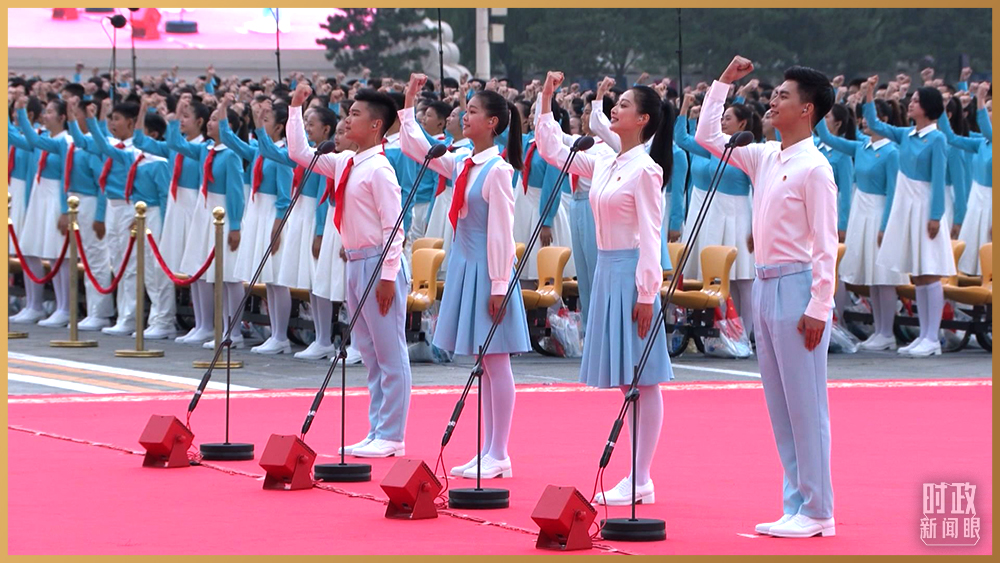 8點整,慶祝大會開始。100響禮炮響徹云霄。現(xiàn)場升國旗、奏唱國歌。此后,各民主黨派、工商聯(lián)和無黨派人士聯(lián)合致賀詞,由共青團員和少先隊員組成的千人方陣集體致獻詞。