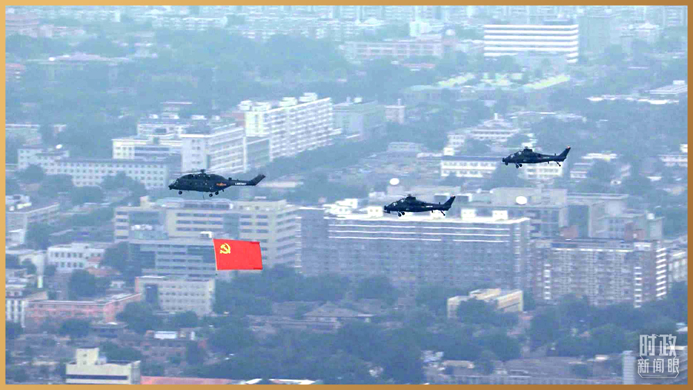 △直升機懸掛鮮紅的中國共產(chǎn)黨黨旗飛過。
