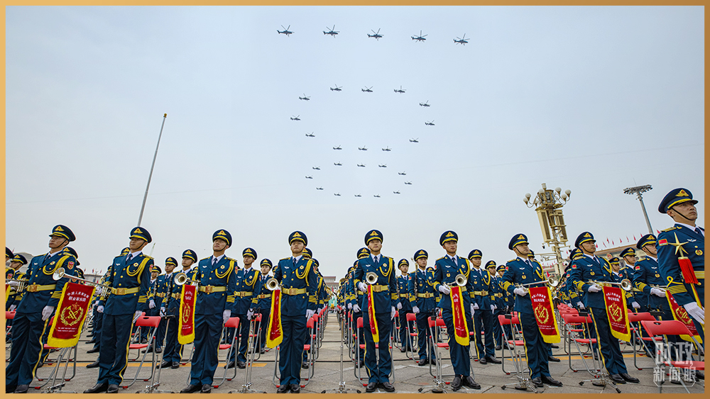 △29架直升機組成“100”字樣掠過長空。(總臺記者廖江衡拍攝)