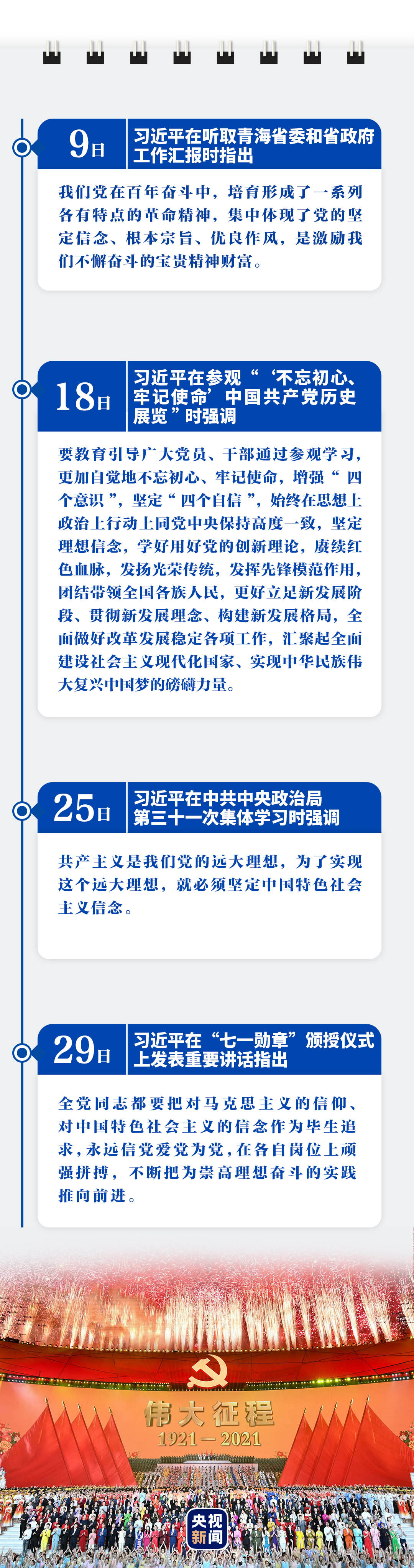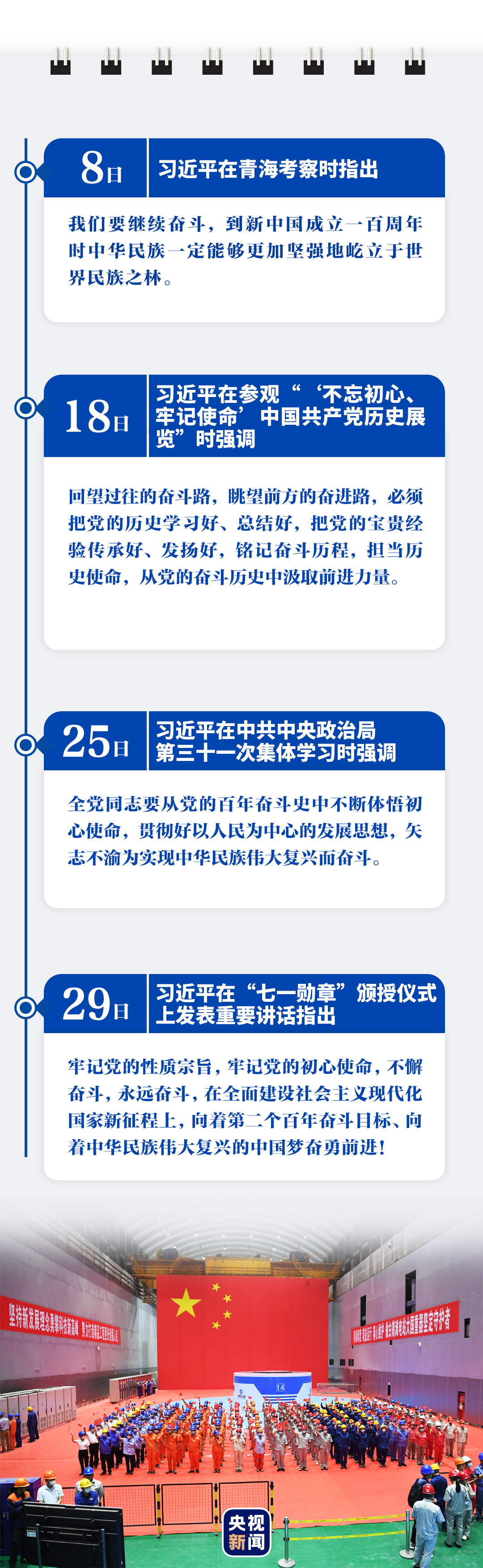 赴中國(guó)共產(chǎn)黨歷史展覽館,參觀“‘不忘初心、牢記使命’中國(guó)共產(chǎn)黨歷史展覽”,并帶領(lǐng)黨員領(lǐng)導(dǎo)同志重溫入黨誓詞;赴北大紅樓參觀主題展覽、到豐澤園毛澤東同志故居參觀瞻仰,主持中央政治局第三十一次集體學(xué)習(xí);觀看慶祝中國(guó)共產(chǎn)黨成立100周年文藝演出《偉大征程》;向“七一勛章”獲得者頒授勛章,并發(fā)表重要講話……習(xí)近平總書記6月的很多重要活動(dòng),都與慶祝建黨百年有關(guān)。