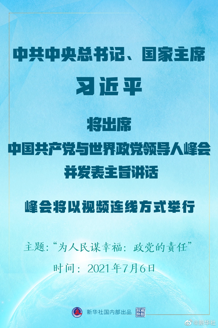 中共中央對外聯(lián)絡部發(fā)言人胡兆明5日宣布,中國共產(chǎn)黨與世界政黨領(lǐng)導人峰會將于7月6日以視頻連線方式舉行,中共中央總書記、國家主席習近平將在北京出席會議并發(fā)表主旨講話。此次會議的主題為“為人民謀幸福:政黨的責任”,160多個國家的500多位政黨和政治組織等領(lǐng)導人以及逾萬名政黨代表等將出席會議。
