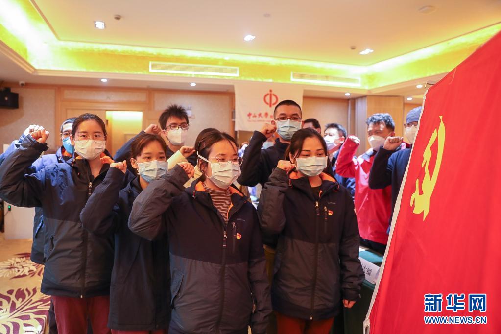 廣州中山大學(xué)附屬第一醫(yī)院馳援武漢醫(yī)療隊(duì)火線(xiàn)入黨的新黨員在武漢漢口醫(yī)院宣誓(2020年3月2日攝)。新華社發(fā)