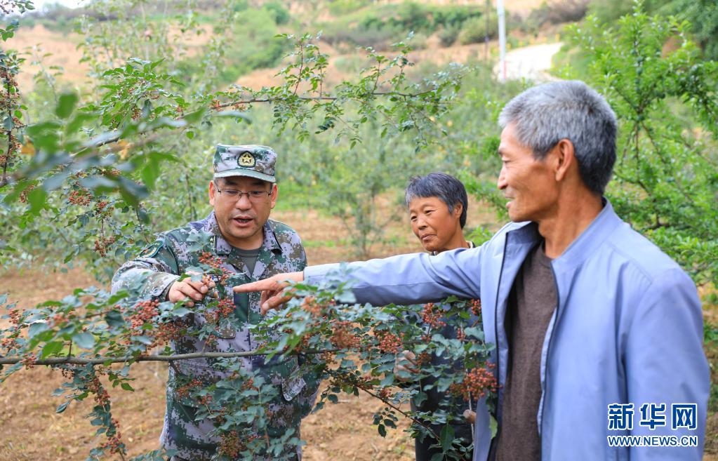 張洪峰(左)深入田間地頭了解花椒價(jià)格,和群眾一起探討花椒培育技術(shù)(2020年7月10日攝)。新華社發(fā)(張仲海 攝)