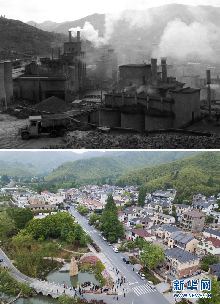 拼版照片:上圖為浙江省湖州市安吉縣天荒坪鎮(zhèn)余村二十世紀八十年代的資料照片;下圖為2018年4月24日,游客在整修一新的余村游覽(新華社記者翁忻旸攝)。 新華社發(fā)