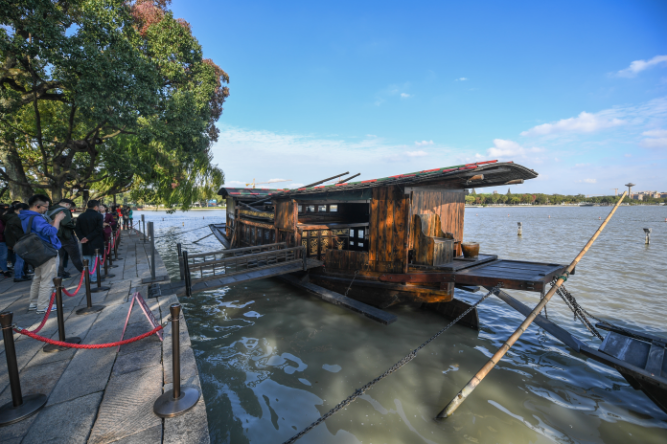 △??吭谡憬闻d南湖湖心島的南湖紅船(2020年10月27日攝)。新華社記者 徐昱 攝