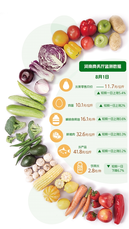 據(jù)了解,河南省商務(wù)廳自7月21日起便啟動(dòng)了生活必需品市場監(jiān)測日報(bào),對河南全省220家樣本企業(yè)、11個(gè)大類、72個(gè)品種商品實(shí)施監(jiān)測。8月1日監(jiān)測數(shù)據(jù)顯示,72個(gè)品種較前一日相比呈現(xiàn)“36漲14平22降”。分大類看,水果零售均價(jià)為11.7元/公斤、雞蛋10.1元/公斤、桶裝食用油16.1元/升、鮮豬肉32.6元/公斤、水產(chǎn)品41.8元/公斤,較前一日分別上漲5.4%、2%、0.6%、0.3%、0.2%;飲用水2.8元/升,較前一日下降6.7%;糧食5元/公斤、蔬菜5.7元/公斤,與前一日持平。