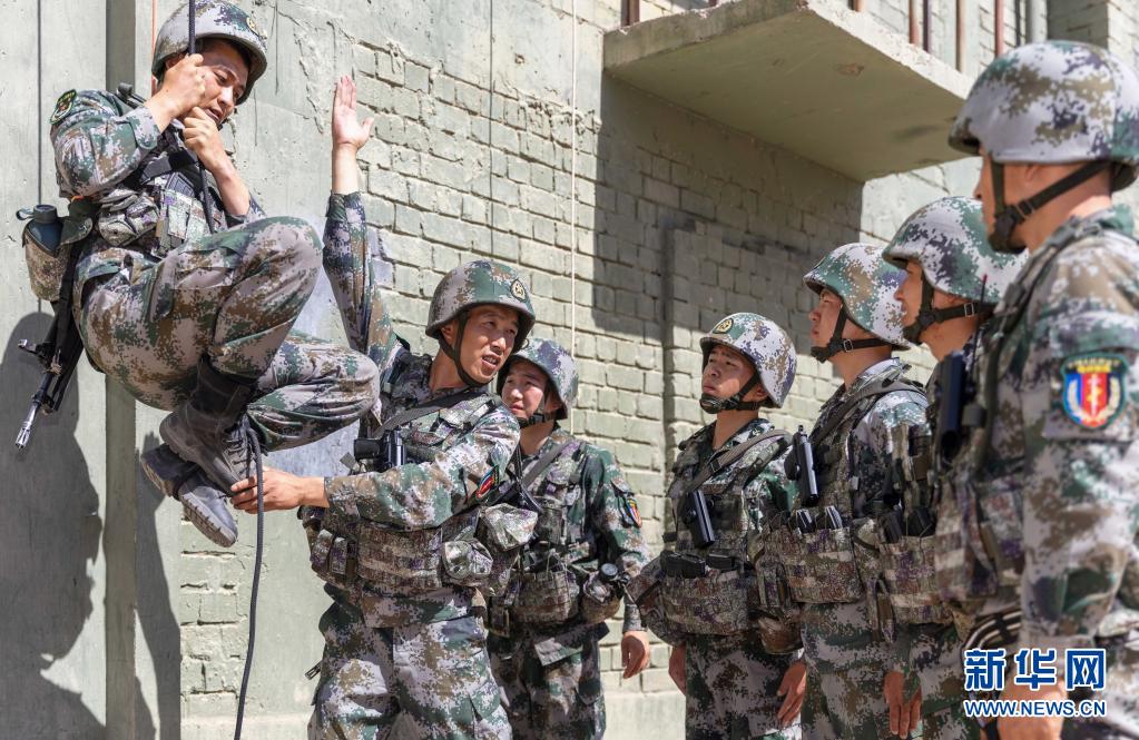 陸軍第76集團(tuán)軍某特戰(zhàn)旅特戰(zhàn)營(yíng)營(yíng)長(zhǎng)劉近(左二)為戰(zhàn)士講解攀登動(dòng)作要領(lǐng)(7月7日攝)。新華社發(fā)(陳浩 攝)