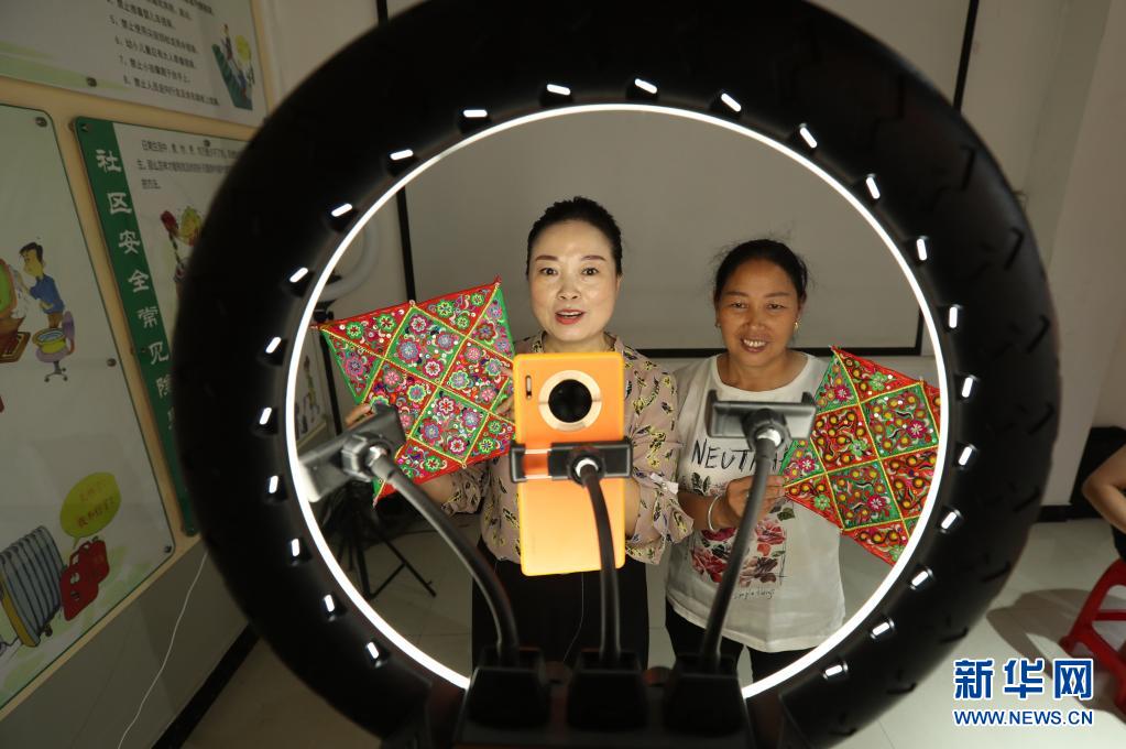 7月5日,在貴州省黔東南苗族侗族自治州榕江縣場壩社區(qū)服務(wù)中心網(wǎng)絡(luò)直播營銷技能培訓(xùn)教室里,學(xué)員在直播營銷刺繡手工藝品。新華社發(fā)(李長華 攝)