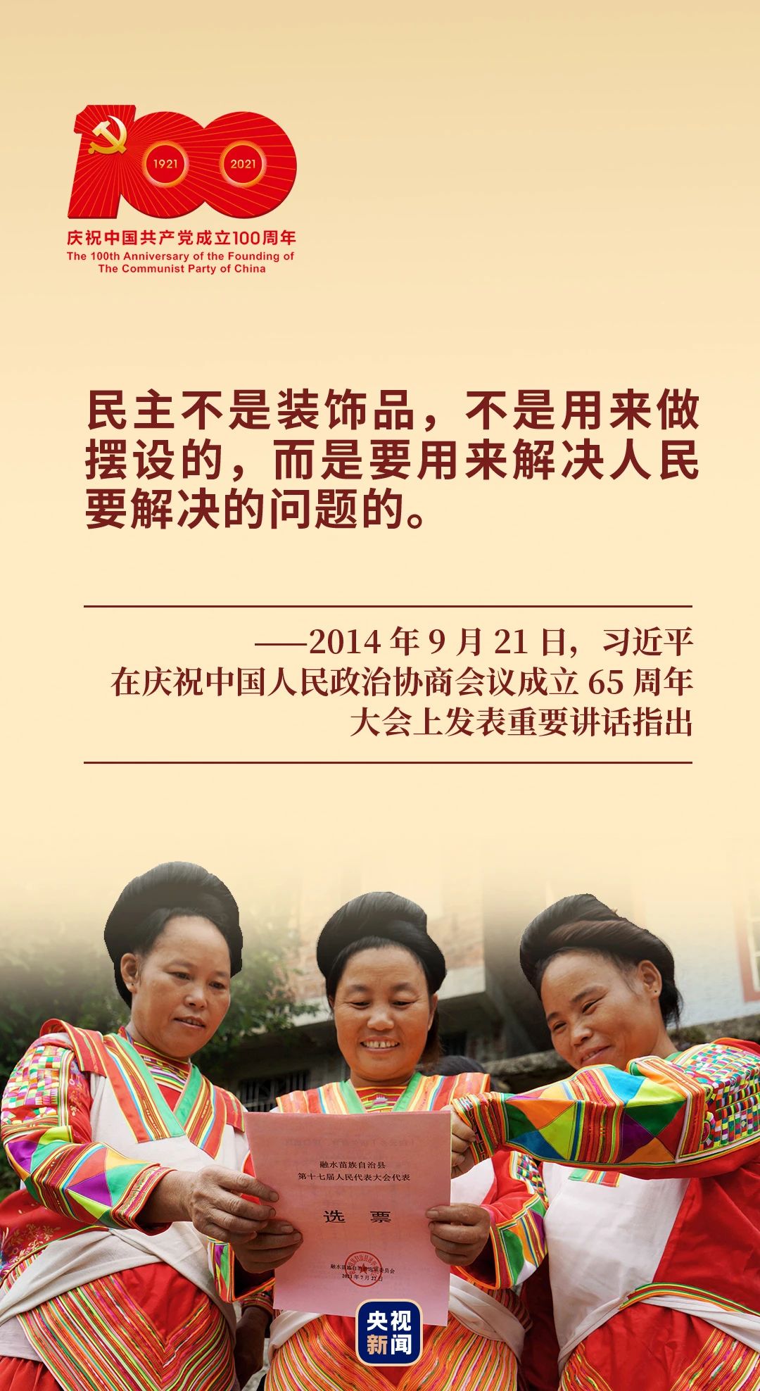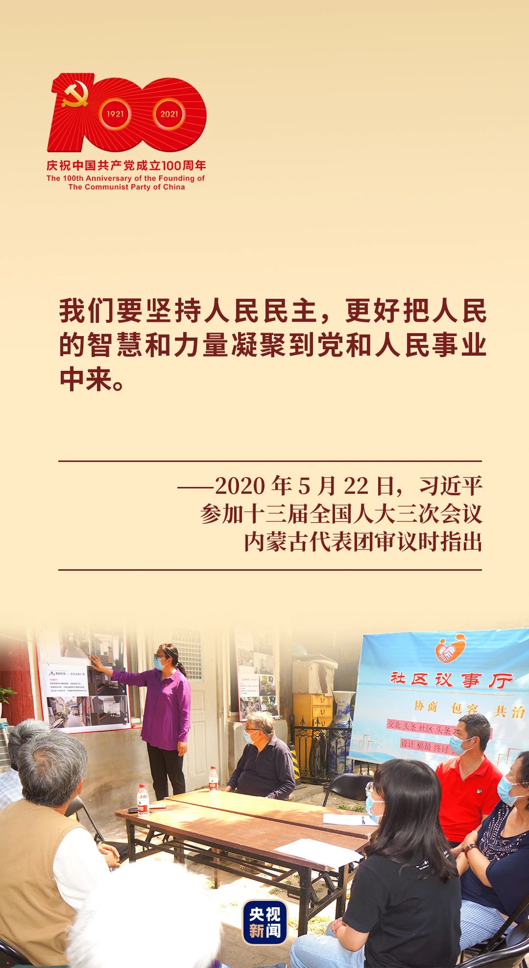 一百年來(lái),在中國(guó)共產(chǎn)黨帶領(lǐng)下,在自強(qiáng)、自立的過程中,中國(guó)人民探索出一條適合自己的民主政治模式——社會(huì)主義民主政治,充分保證和支持人民當(dāng)家作主。