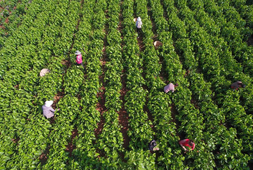 云南省尋甸縣金所街道草海子村的農(nóng)婦在采摘蠶桑葉(2020年5月16日攝,無人機照片)。新華社記者 楊宗友 攝