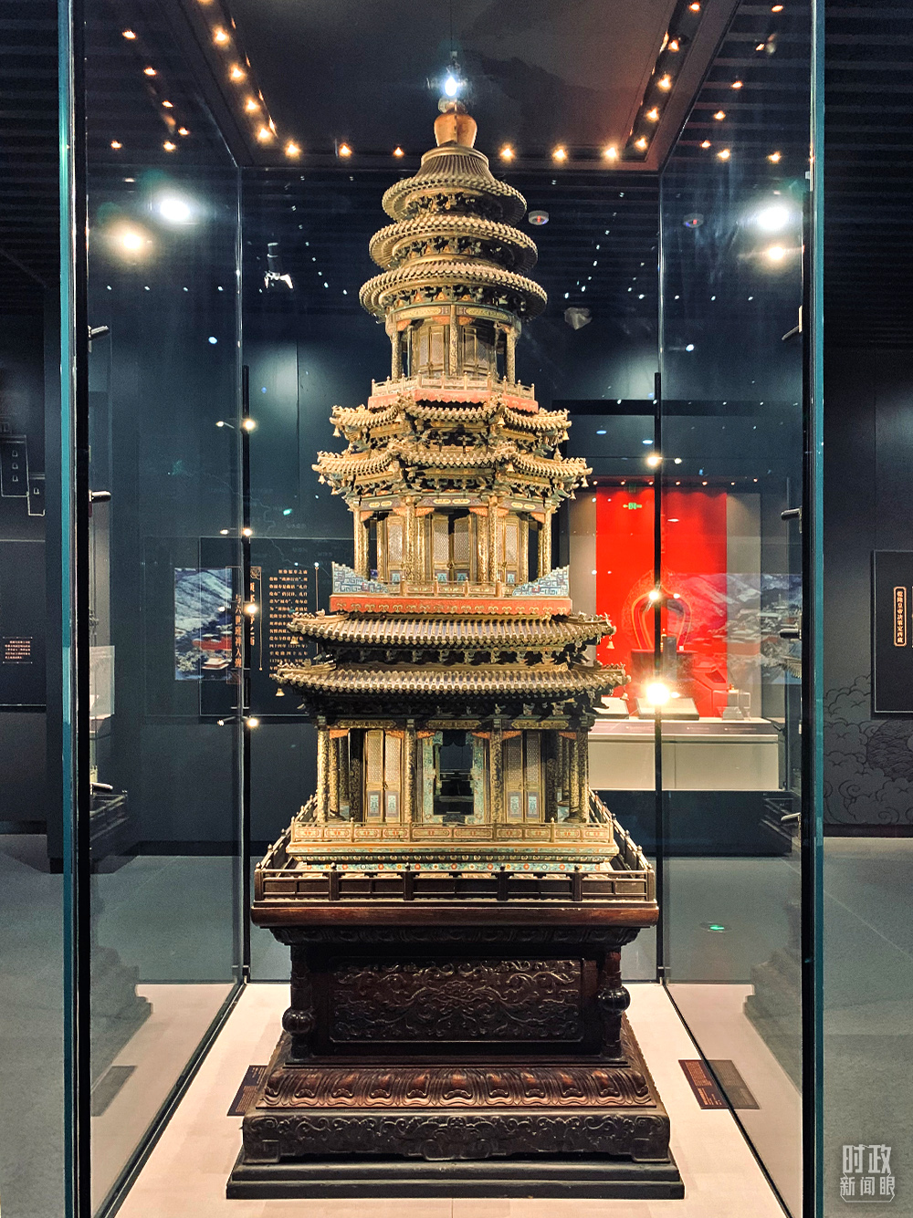 △承德博物館鎮(zhèn)館文物——清紫檀木座銅胎琺瑯?biāo)?,通?05厘米。乾隆皇帝為迎接六世班禪來(lái)承德朝覲,下諭旨興建須彌福壽之廟,并將這一文物移來(lái)此處。(總臺(tái)央視記者范一鳴拍攝)