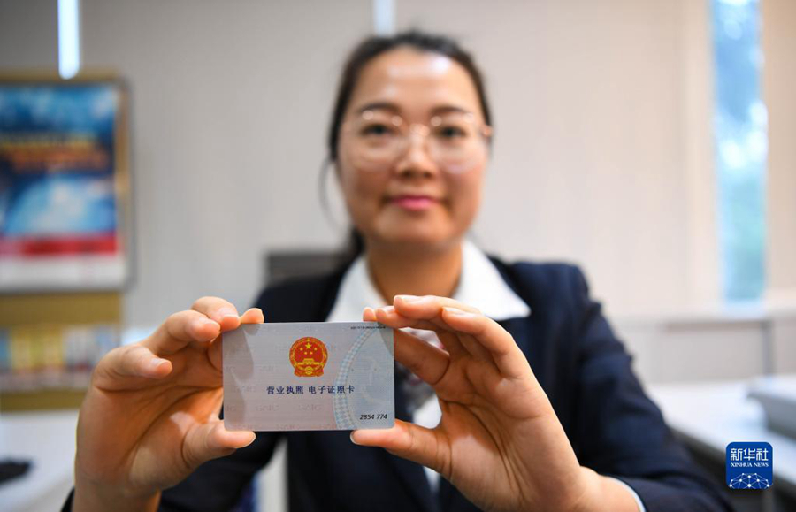 中國銀行橫琴分行工作人員展示商事主體電子證照銀行卡(2018年11月15日攝)。新華社記者鄧華攝
