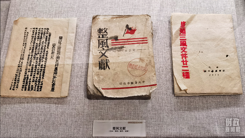 △中共綏德地委舊址專題展陳,從左至右分別是整風(fēng)文獻(xiàn)的刻印版、原件和復(fù)制版。(總臺(tái)央視記者馬立飛拍攝)