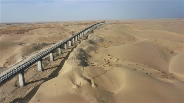和若鐵路為國家重點鐵路建設項目,線路全長825.476公里,2018年12月開工建設,連通南疆和田地區(qū)和田市與巴音郭楞蒙古自治州若羌縣。完成鋪軌的和若鐵路與現(xiàn)有格庫鐵路、喀和鐵路、南疆鐵路連通,環(huán)繞塔克拉瑪干沙漠一周,構(gòu)成世界首條環(huán)沙漠鐵路線。
