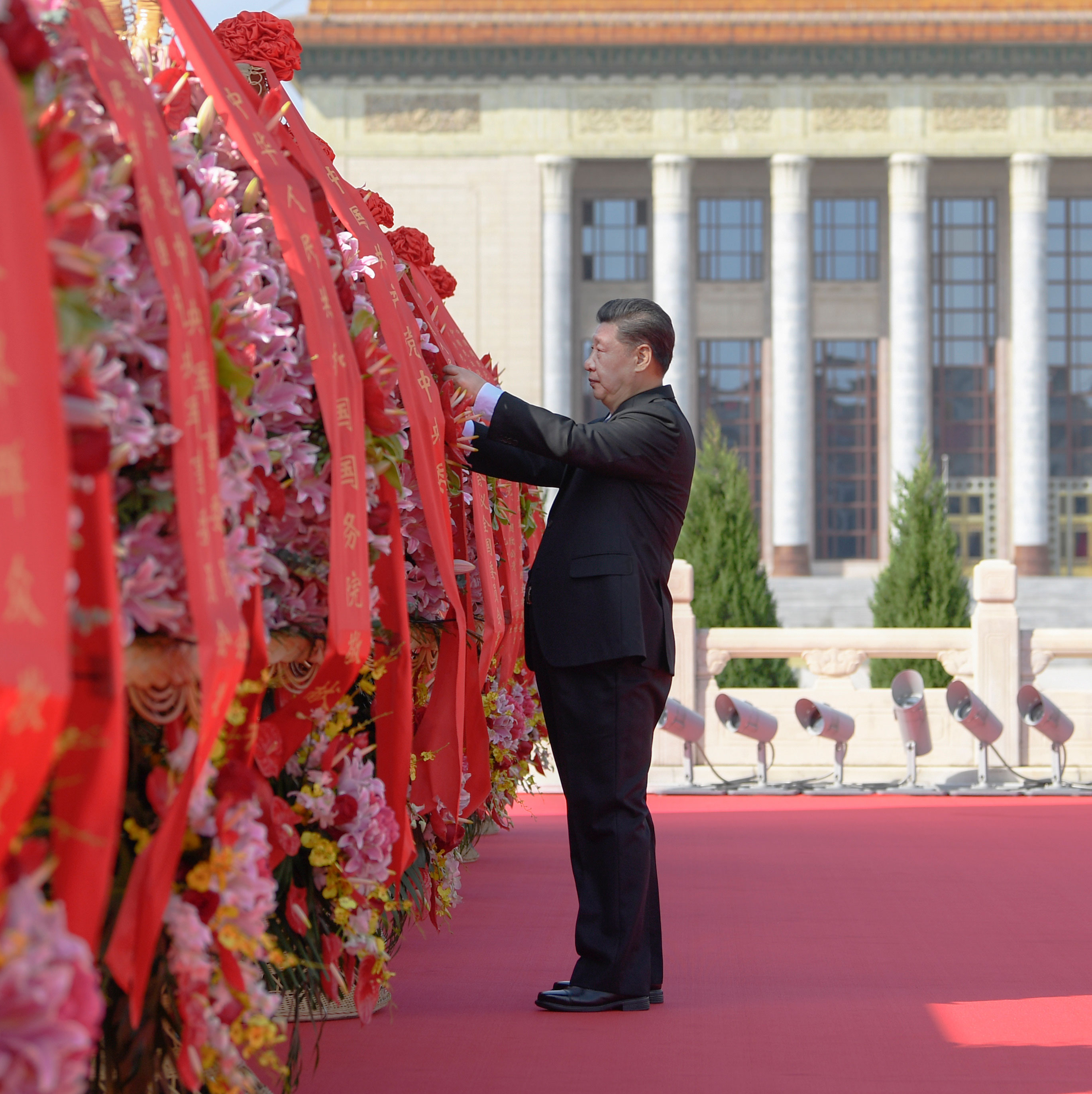 △2020年9月30日上午,習(xí)近平總書記出席烈士紀念日向人民英雄敬獻花籃儀式。這是習(xí)近平總書記整理花籃上的緞帶。