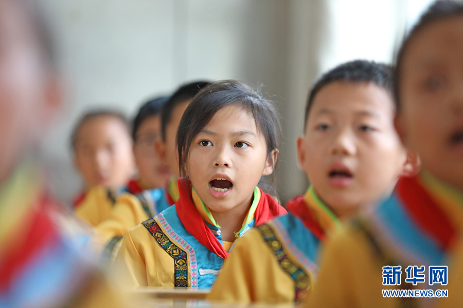 課堂上,彭水自治縣鞍子鎮(zhèn)小學(xué)4年級(jí)1班孩子們正跟著任茂淑一起傳唱苗族民歌。新華網(wǎng)發(fā)(趙勇 攝)
