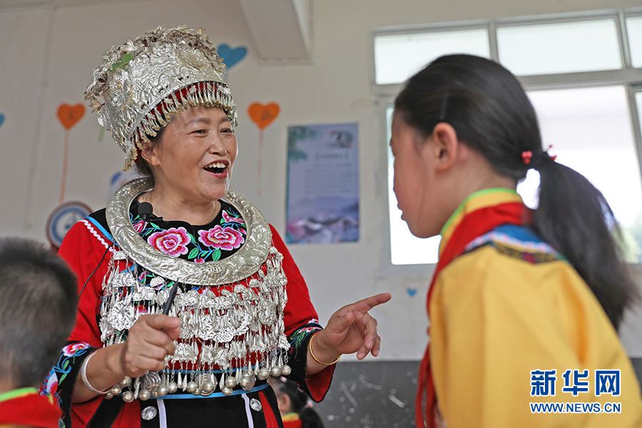 9月28日,“苗族民歌”非物質(zhì)文化遺產(chǎn)傳承人任茂淑正在課堂上教孩子們傳唱苗族民歌代表作《嬌阿依》。新華網(wǎng)發(fā)(趙勇 攝)