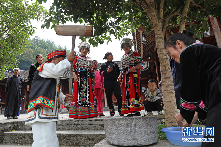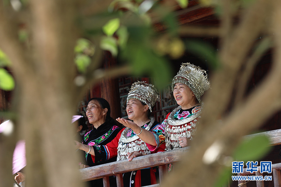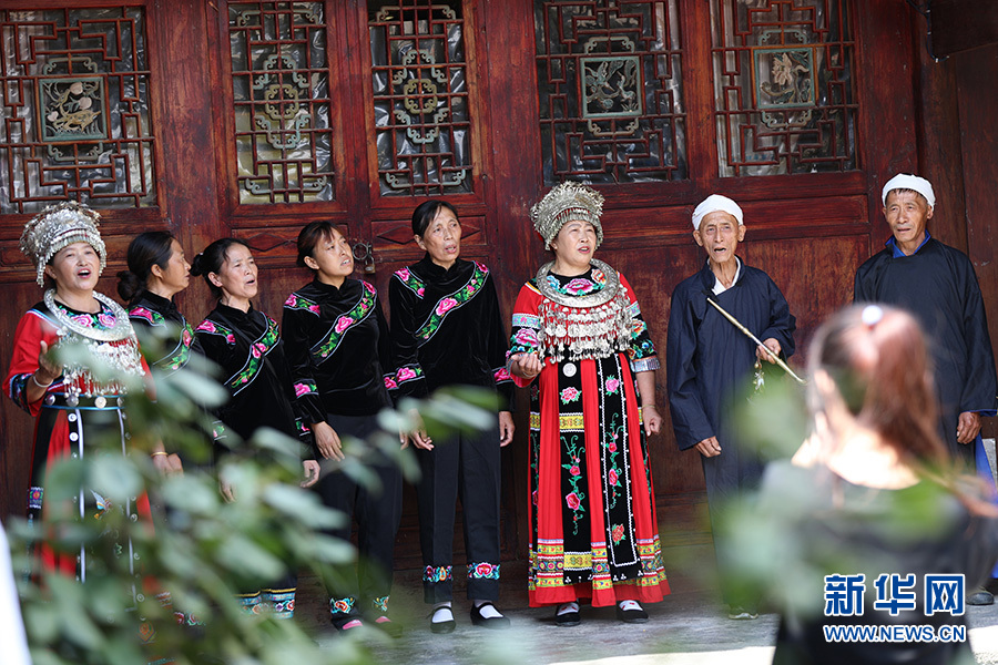 9月28日,在彭水自治縣鞍子鎮(zhèn)羅家坨苗寨,村民們正在綠樹掩映的吊腳樓上演唱苗族民歌。新華網(wǎng)發(fā)(趙勇 攝)