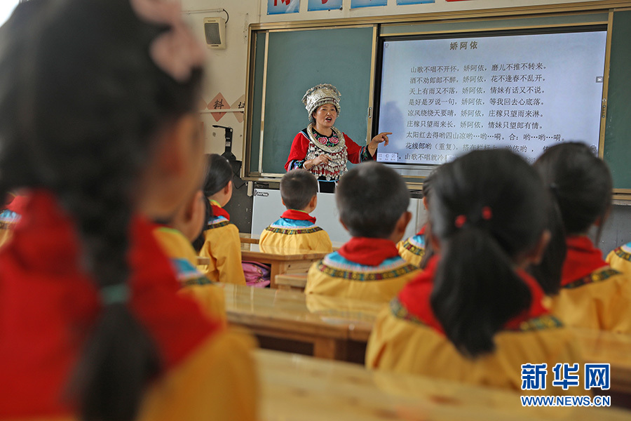 在教室內(nèi),任茂淑不僅面對(duì)面地教唱,還細(xì)心地為孩子們講解民歌的內(nèi)涵。她說,自己作為一名非遺傳承人,每學(xué)期都要到學(xué)校為孩子們教唱苗族民歌,通過傳承人走進(jìn)課堂的方式,讓更多學(xué)生了解苗歌、傳唱苗族民歌,更好地保護(hù)和傳承這一非物質(zhì)文遺產(chǎn)。新華網(wǎng)發(fā)(趙勇 攝)