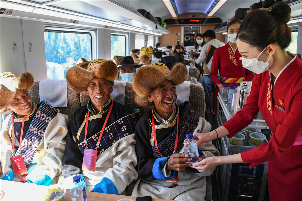 6月25日,全長(zhǎng)435公里、設(shè)計(jì)時(shí)速160公里的拉林鐵路建成通車,西藏首條電氣化鐵路建成,同時(shí)復(fù)興號(hào)實(shí)現(xiàn)對(duì)31個(gè)省區(qū)市全覆蓋。這是列車員向乘坐首趟復(fù)興號(hào)高原內(nèi)電雙源動(dòng)車組的乘客遞水。新華社記者 普布扎西 攝