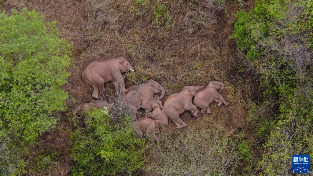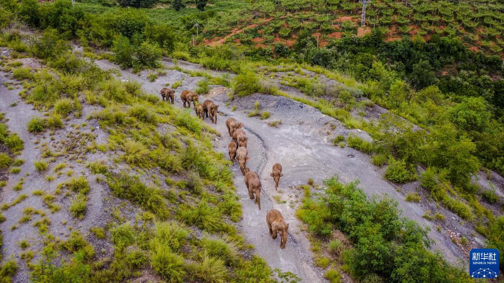 2021年6月7日在云南昆明市晉寧區(qū)夕陽(yáng)彝族鄉(xiāng)拍攝的野象(無(wú)人機(jī)照片)。新華社發(fā)