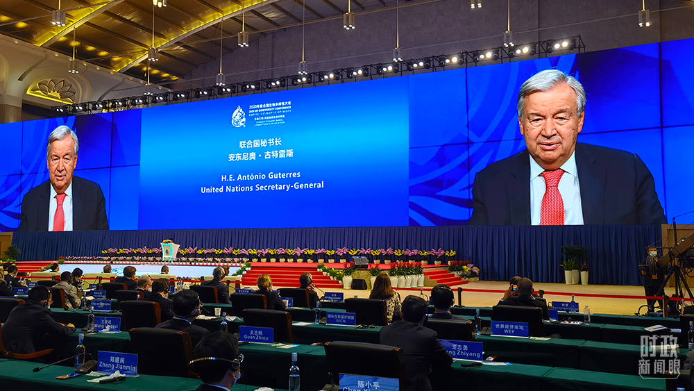 △聯(lián)合國(guó)秘書(shū)長(zhǎng)古特雷斯通過(guò)視頻方式致辭。(總臺(tái)央視記者舒貝拍攝)