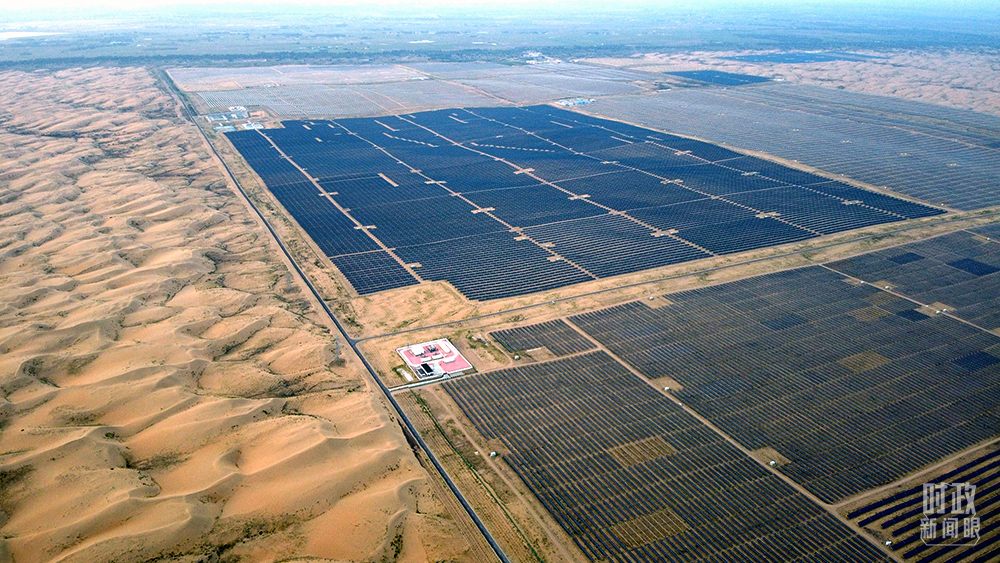 △內(nèi)蒙古鄂爾多斯,達(dá)拉特旗光伏發(fā)電領(lǐng)跑獎(jiǎng)勵(lì)基地,是全球最大的沙漠集中式光伏電站。(圖/視覺(jué)中國(guó))