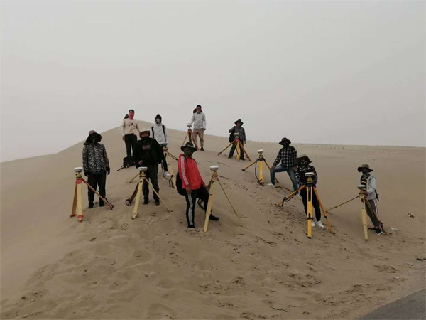 后來,唐飛帶領(lǐng)團(tuán)隊(duì)又前往新疆若羌,為中鐵一局三公司和若鐵路項(xiàng)目進(jìn)行前期控制網(wǎng)復(fù)測。項(xiàng)目線路長、地廣人稀,且地處塔克拉瑪干沙漠邊緣。為了節(jié)省時間,每天早上他和隊(duì)員背著馕、咸菜、礦泉水出發(fā),在沙漠戈壁一測就是十二個小時,晚上八九點(diǎn)左右才能回去吃口熱飯。有一次,他們在工地上測量時,突遇沙塵暴,他和三個組員趕快收拾儀器,裝進(jìn)儀器箱,四個人圍在一起,等著沙塵暴過去。