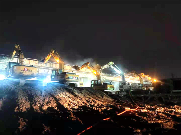 在施工現(xiàn)場,隨著指揮員的一聲令下,50多臺設(shè)備齊裝上陣,轟隆作業(yè)。由于該兩座橋同時上跨京滬高速公路,現(xiàn)場作業(yè)空間有限。為確保此次拆橋任務(wù)安全順利進(jìn)行,同時降低施工影響,京滬高速公路HA4標(biāo)項(xiàng)目部對施工現(xiàn)場進(jìn)行詳細(xì)調(diào)查,多次組織召開專家施工方案評審會,反復(fù)論證,細(xì)化橋梁拆除方案,精準(zhǔn)把控施工計劃;項(xiàng)目部領(lǐng)導(dǎo)班子和管理人員,全稱盯控,確保拆除工作萬無一失。