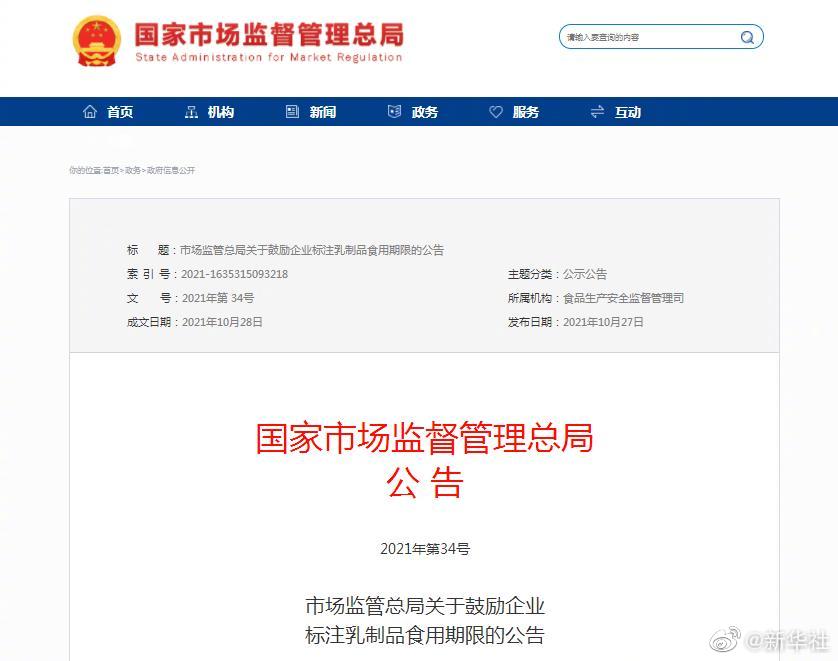 為方便消費(fèi)者識(shí)別乳制品的食用期限,避免食物浪費(fèi),市場(chǎng)監(jiān)管總局28日發(fā)布關(guān)于鼓勵(lì)企業(yè)標(biāo)注乳制品食用期限的公告,鼓勵(lì)食品生產(chǎn)企業(yè)生產(chǎn)的需冷藏保存的巴氏殺菌乳、發(fā)酵乳,在標(biāo)明生產(chǎn)日期的基礎(chǔ)上,明確標(biāo)注保質(zhì)期到期日,如“保質(zhì)期至XXXX年XX月XX日”“請(qǐng)于XXXX年XX月XX日前食(飲)用”等。按照食品安全法規(guī)定,食品標(biāo)簽應(yīng)當(dāng)標(biāo)注生產(chǎn)日期、保質(zhì)期。(記者趙文君)