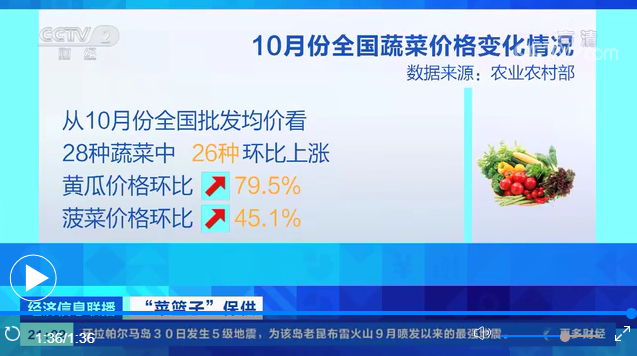 10月份,農(nóng)業(yè)農(nóng)村部監(jiān)測的28種蔬菜全國平均批發(fā)價每公斤5.23元,環(huán)比上漲16%,同比上漲12.5%。和往年10月份秋季蔬菜會出現(xiàn)季節(jié)性下行的行情不同,今年10月份菜價卻逆季節(jié)上行。