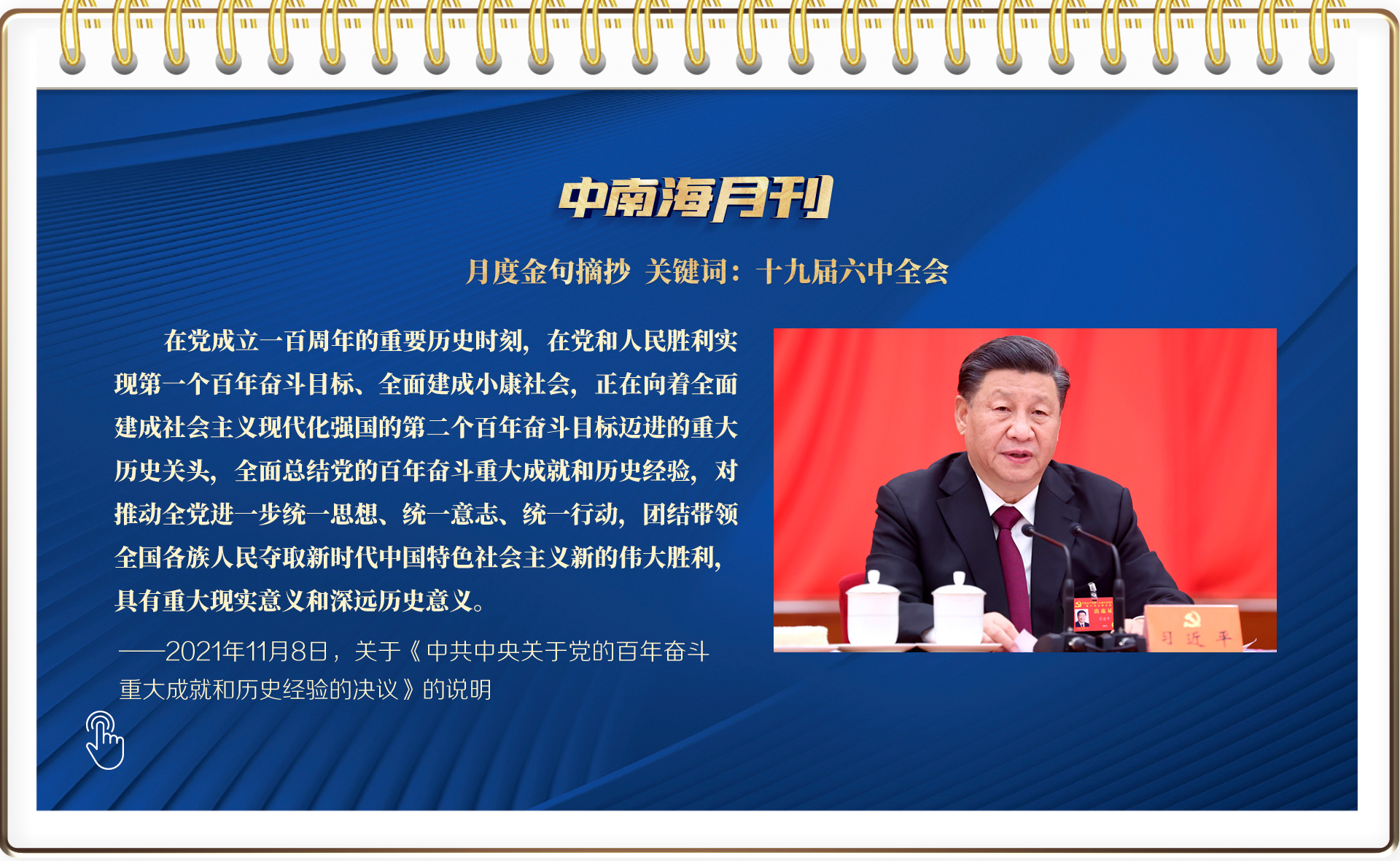 這個月,中國共產(chǎn)黨第十九屆中央委員會第六次全體會議(以下簡稱十九屆六中全會)在京召開,習近平總書記作重要講話。全會審議通過了《中共中央關(guān)于黨的百年奮斗重大成就和歷史經(jīng)驗的決議》,《決議》總結(jié)了黨團結(jié)帶領(lǐng)人民群眾百年奮斗的重大歷史成就,凝聚起向第二個百年奮斗目標奮進的強大力量。