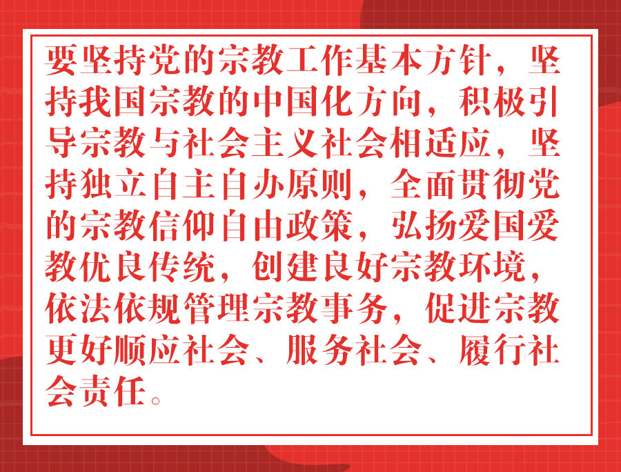 12月3日至4日,全國宗教工作會議在北京召開。中共中央總書記、國家主席、中央軍委主席習(xí)近平出席會議并發(fā)表重要講話。李克強、栗戰(zhàn)書、汪洋、王滬寧、趙樂際、韓正出席會議。