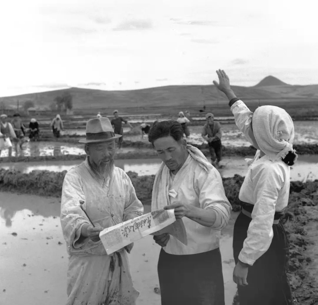 1954年6月26日,“中華人民共和國憲法草案”公布的消息傳到了吉林省延邊朝鮮族自治區(qū),正在田間勞動(dòng)的崔竹松農(nóng)業(yè)生產(chǎn)合作社社員們爭相趕來閱讀公布憲法草案的好消息。新華社發(fā)