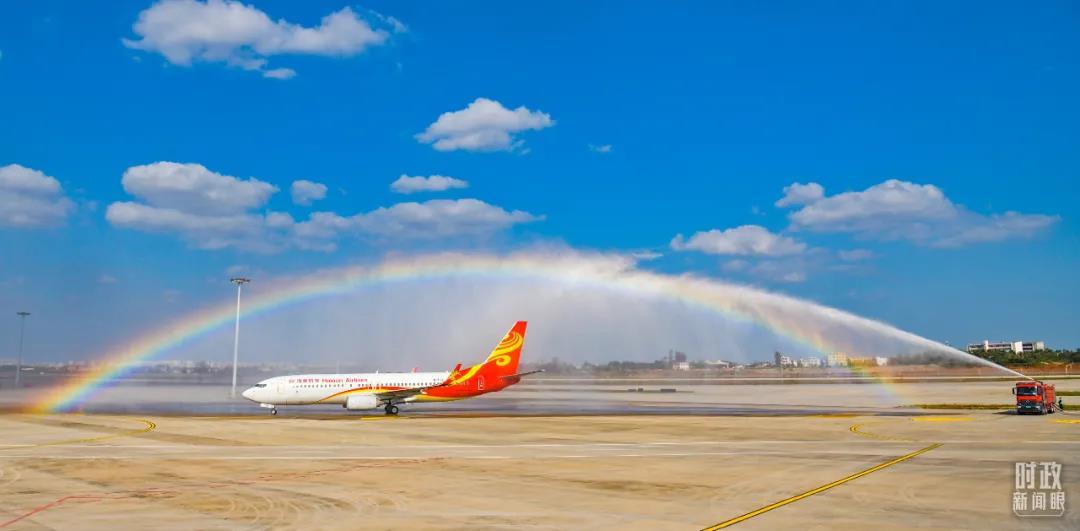 △2021年12月2日,??诿捞m國(guó)際機(jī)場(chǎng)二期正式投運(yùn)。這是首個(gè)抵達(dá)機(jī)場(chǎng)二期的航班通過(guò)水門(mén)。(圖/視覺(jué)中國(guó))